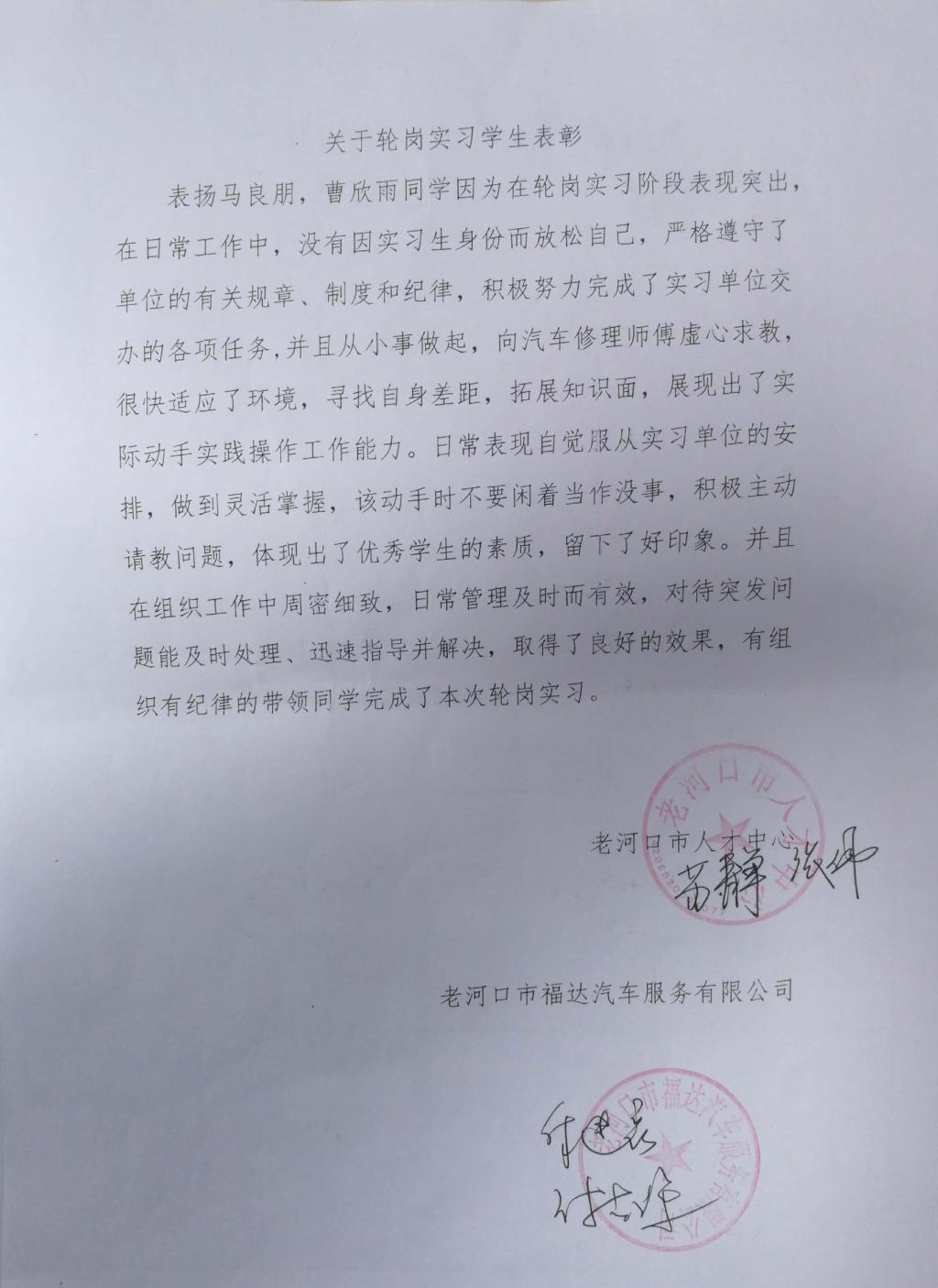 近日,汽车工程学院20级汽检专业马良朋、曹欣雨同学因在轮岗实习阶段表现突出,在实习过程遵守纪律、认真学习,并在所在班级同学们实习过程中很好地进行了组织和管理工作,受到老河口市人才中心和所在实习企业福达汽车服务有限公司的联合表彰。