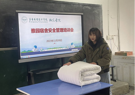 辅导员结合日常查寝情况、与宿管阿姨沟通的寝室管理难处,根据园区学生专业特点,精心准备培训内容。各园区培训侧重点不同,但都包含宿舍内务整理、寝室人际关系、安全用电、学习成长四个方面。雅园宿舍管理培训会上,邀请退役复学学生现场教学叠出“豆腐块”;清园、静园新区宿舍管理培训会上,结合文明寝室申报情况,着重强调宿舍公约的制定与执行;静园老区宿舍管理培训会上,以案例分析的方式,多角度讲解宿舍矛盾解决的方式方法。