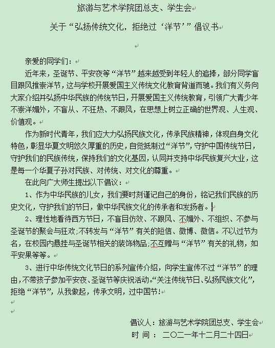 12月24日,旅游与艺术学院向全院师生发出倡议“弘扬传统文化,拒绝过‘洋节’”。在团总支的号召下,该院团总支、学生会干部拟定倡议书并通过微信、微博转发,深入教室、寝室等线上线下相结合的方式广泛宣传,得到了青年学生的积极参与。同学们纷纷表示:将积极响应号召,弘扬民族文化,传承民族精神,成为中华民族优秀传统文化的践行者,传承者。