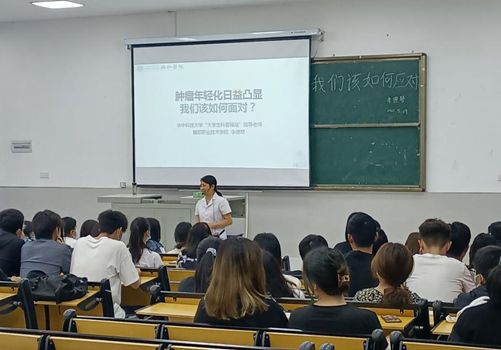 讲座从专业角度详细介绍了肿瘤日益年轻化的现状及年轻人常发肿瘤的诱因,提出了应对肿瘤年轻化的对策,教会同学们如何及早发现和有效应对,并现场支招——规律作息,保持充足睡眠;合理饮食,营养全面均衡;保持良好心理状态,戒烟限酒,适当运动;疫苗预防接种,定期检查。