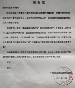 寒假期间,信息技术学院团总支积极响应校团委号召,在院党总支统一部署下,以线上发动为主要形式,组织动员返回居住地的学生,服从当地疫情防控大局,主动向当地团组织、青年志愿者组织或社区(村)报到,在做好自身安全防护的基础上,力所能及地参与各项志愿服务活动。