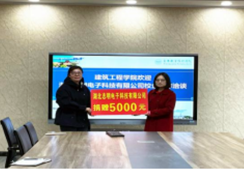 当天,湖北志明电子科技公司向建筑工程学院捐赠5000元,用于支持专业建设、大学生创新创业、大学生活动等。