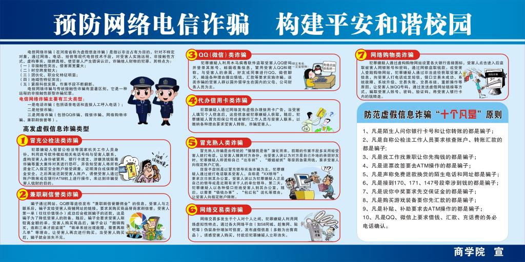 为坚决遏制电信网络诈骗犯罪多发高发态势,预防和减少学生网络电信诈骗受骗案件的发生,进一步增强学生自觉防范网络电信诈骗意识,全面提升学生识骗防骗能力,商学院在全体学生中开展以“强化自我防范意识,提高识骗防骗能力”为主题的系列防范网络电信诈骗宣传活动。
