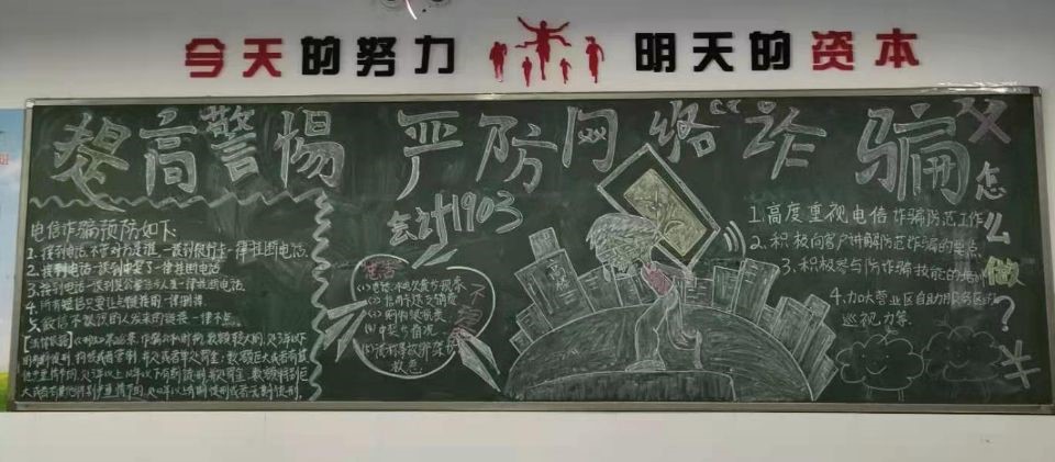 之前,商学院要求各班策划设计了一期以“网络电信诈骗离我们有多远”为主题的宣传黑板报和知识展板,揭示骗子常用的网络电信诈骗手法,提高学生识骗防骗能力。