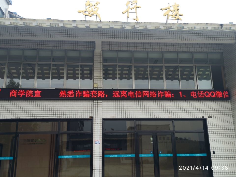 充分利用笃学楼、敏行楼门口电子屏,滚动播放预防网络电信诈骗知识,以视觉反复警示学生树立防范网络电信诈骗意识,提高识别网络电信诈骗能力,杜绝网络电信诈骗和受骗案件的发生。