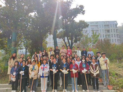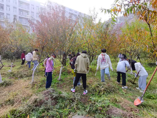11月7日,立冬节气,师范学院党总支书记张丹、学工辅导员、主要学生干部齐聚博爱楼后的桃李林。大家一起刷树、除草,现场一片欢声笑语。