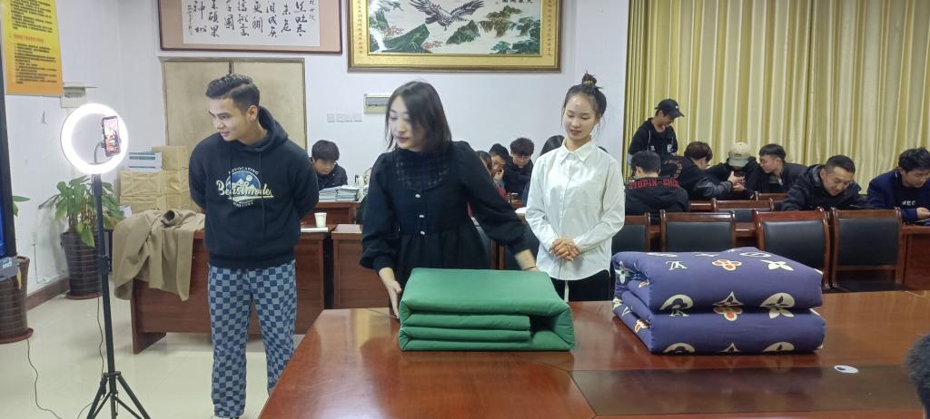 镜头前,退役复学士兵讲解了叠军被、棉被的步骤:压被子、量长度、折中距、折叠处定型、压平被背,同学们认真观看每一个步骤后,上手操作。退役复学同学对每一名走进直播间的同学作了现场指导。