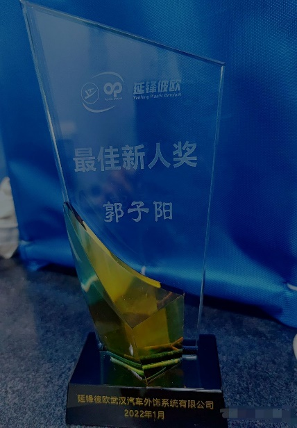 汽车工程学院工业机器人1901班郭子阳同学,因表现优秀,被实习企业延峰彼欧武汉汽车外饰系统有限公司授予最佳新人奖。