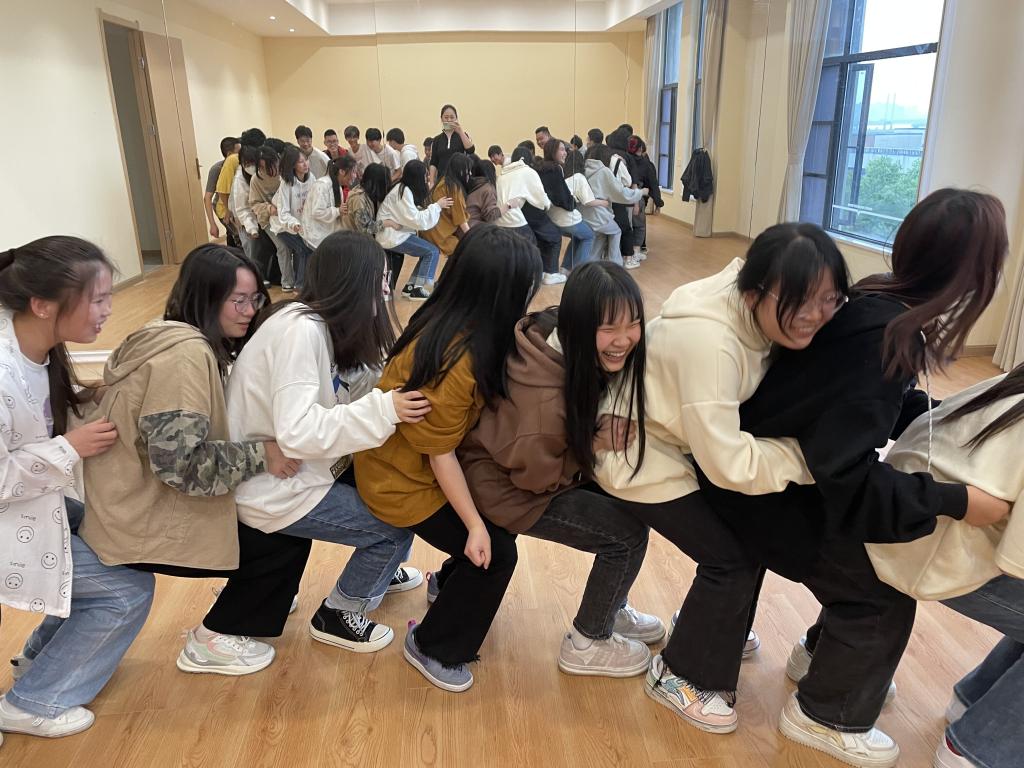 在导入游戏“抓住好运,摆脱厄运”中,同学们在抓手指游戏中注意力高度集中,在欢笑中体验紧张和放松,抛开杂念。之后又陆续开展了“疯狂人椅”“同心合力”等一系列减压又有收获的心理团辅活动,让同学们在轻松的游戏互动中,不断挑战、超越自我,在感知压力、认识压力的过程中,学会与压力共舞。
