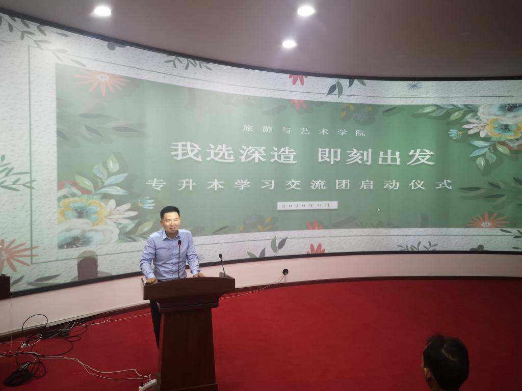 为给有志于专升本的同学加油打气,并从专业备考的角度提供指引和参考,9月24日晚7点,旅游与艺术学院在导游VR实训室举行了“我选深造 即刻出发”专升本学习交流团启动仪式。学工处处长但耀卿处长,旅游与艺术学院党总支书记王壮,副院长张菊芳、涂进喜,陈曦科长出席本次仪式。