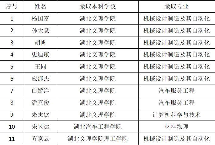 工业机器人技术1901班毕业生专升本成绩喜人!该班13人报名专升本,11人分别被湖北文理学院、湖北汽车工程学院、湖北文理学院理工学院等院校录取,总录取率达85%。其中,10人报名湖北文理学院,9人录取,杨国富同学以总分277分,专业课《高等数学》96分、《机械设计基础》100分的成绩,勇夺报考院校机械设计制造及其自动化专业第一名。具体录取名单如下: