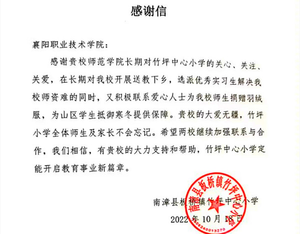 10月18日,师范学院收到南漳县板桥镇竹坪中心小学的感谢信。信中,竹坪小学对学校长期通过送教下乡、选派实习生、联系企业捐赠物资等形式帮助该校发展表示感谢。原来,就在来信前一天,师范学院联系的爱心人士为竹坪小学师生捐赠量身定制的羽绒服93套已送达。