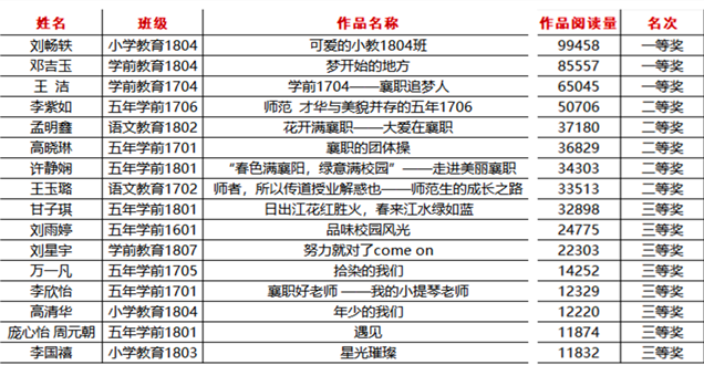 近日,师范学院(特殊教育学院)举办的美篇设计创作大赛揭晓。小学教育1804班刘畅轶、学前教育1804班邓吉玉、学前教育1704班王洁获得一等奖。本次活动中,16篇作品点击率过万。其中,刘畅轶制作的美篇《可爱的小教1804班》点击量高达99458人次。