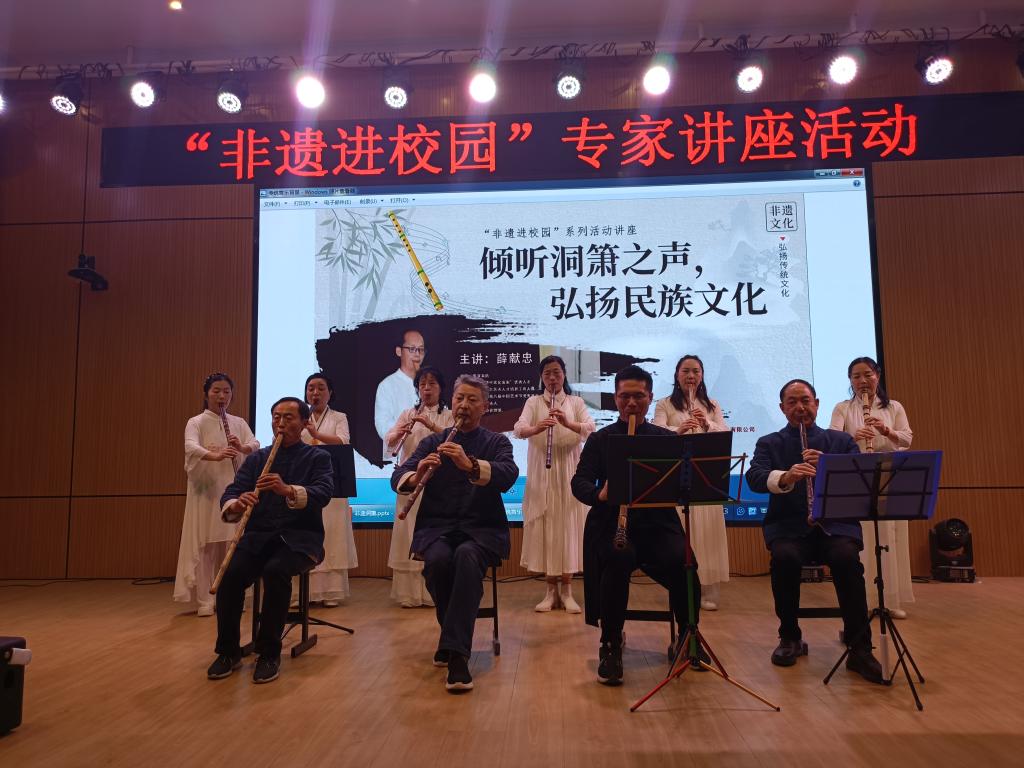 薛献忠老师从洞箫的发展历史、民间故事、在襄阳发展的状况三个方面展开,并现场给同学们演奏了洞箫。