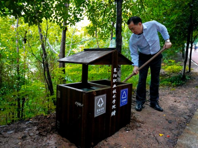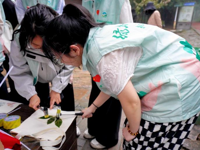 活动全程紧扣“保护环境” 核心:师生统一身着校服,冒着小雨沿岘山步道细致捡拾塑料瓶、废纸等垃圾,雨水打湿了衣袖,却未停下清理生态“污点” 的双手;【1+】青年志愿者协会同步在沿途投放特色分类垃圾桶,为长效维护岘山环境奠定基础。行至三间房驿站,雨势渐缓,千山·民间艺术传承社带领师生就地收集雨中掉落的树叶,将带着湿润气息的叶纹拓印在空白帆布包上,制成承载“雨中岘山记忆”的环保文创品,并主动赠予沿途路人,同时科普“低碳护绿”理念。