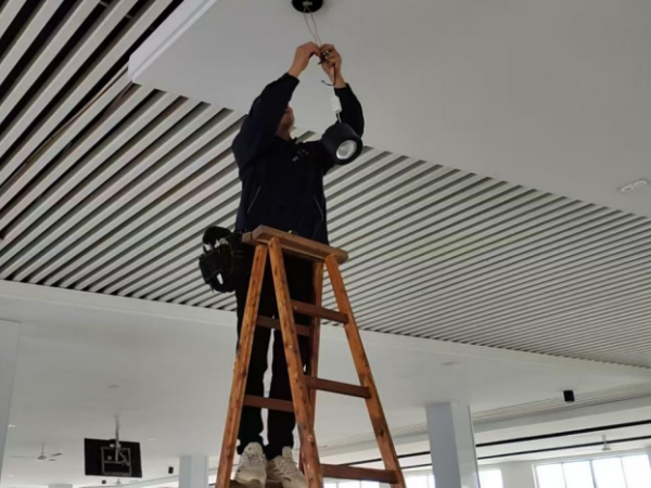 清洁过程中,工作人员严格遵循“保护优先、错峰施工”原则:作业前,先在地面铺设防尘布,收纳周边物品,避免污水和灰尘污染环境;塑料与玻璃灯罩则现场用中性清洁剂轻柔擦拭,配合高压清水冲洗,确保无污渍残留。为不干扰正常教学与生活秩序,大部分清洁工作安排在课后、周末及午休时段,关键区域还设置临时提示牌,引导师生安全绕行。