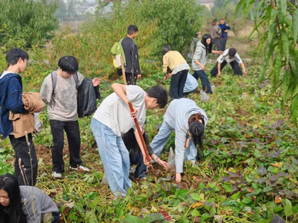 师生们来到种植红薯的田间,两人一组、三人一队,分工协作,有的弯腰翻土,有的徒手刨挖,有的分拣装袋,田间地头一派热火朝天的劳作景象。劳作过程中,老师们不时与学生交流农耕知识,分享生活感悟。