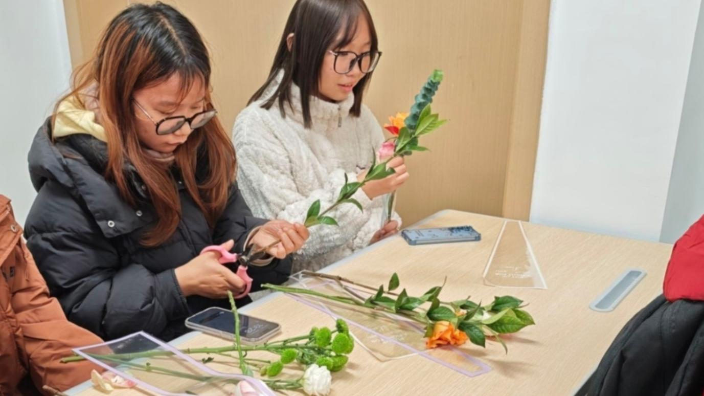 活动现场,花卉与园艺协会指导老师肖楚通过专业讲解,向同学们细致传授了西式插花的构图原则、色彩搭配技巧及花材养护知识。实操环节,同学们手持康乃馨、欢乐颂玫瑰、洋桔梗、尤加利等花材,在老师的指导下精心修剪、搭配、造型,将对美的理解融入指尖创作。从花材的错落布局到整体意境的营造,大家沉浸式体验花艺的优雅韵律,现场花香四溢、氛围温馨。