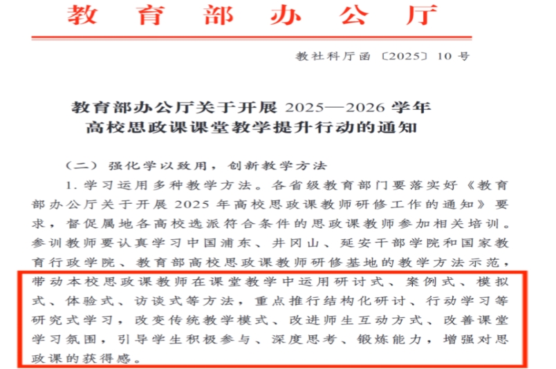 《教育部办公厅关于开展2025—2026学年高校思政课课堂教学提升行动的通知》明确提出,要大力加强案例教学法和结构式研讨法的教学实践,切实提高思政课的针对性与吸引力。马克思主义学院以研究室为单位,将结构化研讨模式引入《思想道德与法治》课程教学,着力推动课程从“知识传授” 向“价值塑造、能力培养”深度转型,让思政教育在守正创新中“活”起来。