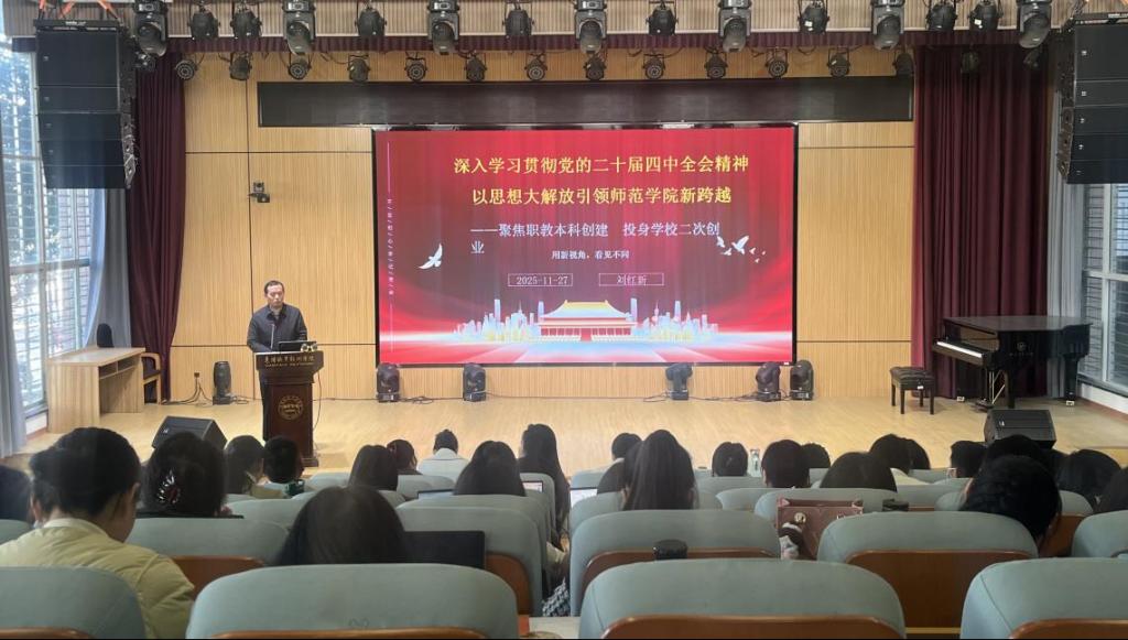 11月27日,师范学院(特殊教育学院)院长刘红新以“以思想大解放引领师范学院新跨越”为题,聚焦职教本科创建与学校二次创业,为全体教职工讲授党课。