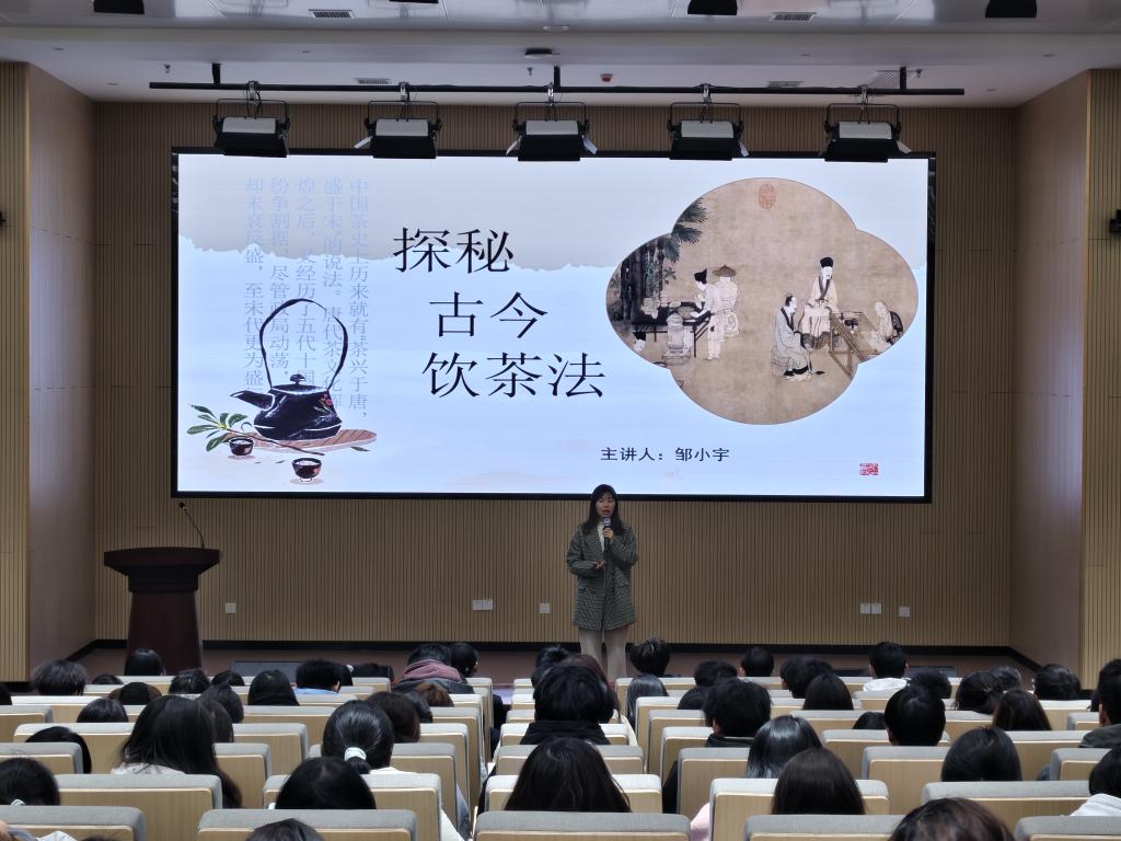 11月27日下午,襄阳职业技术学院“千山书院·我读我悦” 系列活动第69场在高铁南路校区同济楼一楼报告厅顺利举行。本次活动由校图书馆主办,特邀公共课部邹小宇老师带来《探秘古今饮茶法》专题讲座,农学院同学参与其中,共赴一场跨越千年的茶文化盛宴。