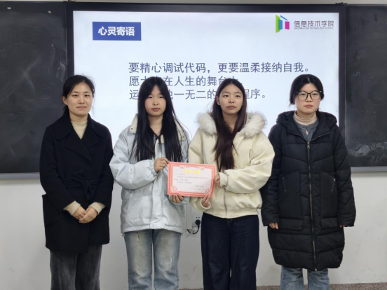 决赛共设四个环节,分别是:“盲盒必答题”“集体共答题”“逆袭翻盘题”“案例分析题”。四个环节既考验知识储备,也比拼反应速度和团队协作。经过激烈角逐,计算机应用技术2502班丁依、彭惠子获得一等奖。全部赛程结束后,活动进入温馨的“录制心灵寄语”环节,积极向全院学生传递健康向上的心理正能量。