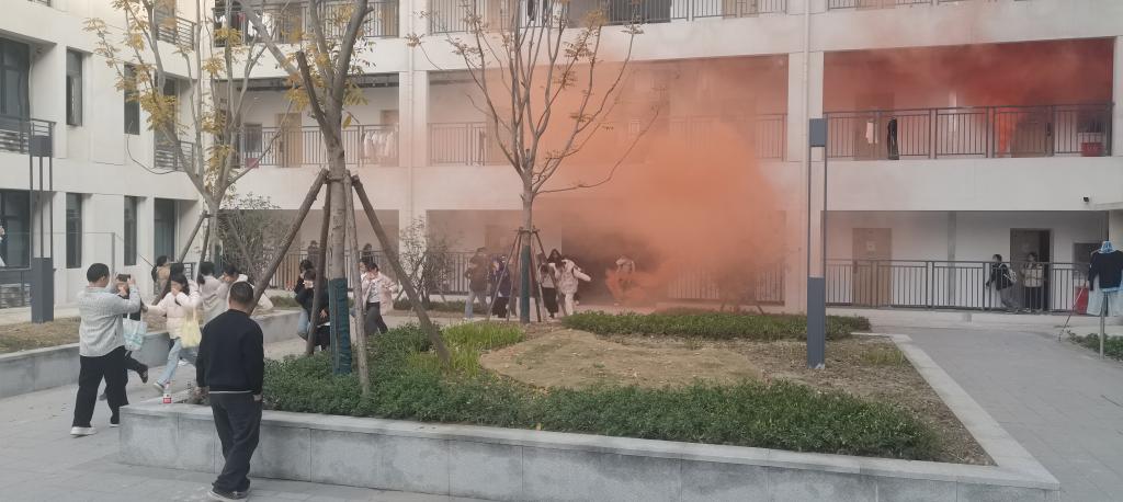 “呜、呜……”12月11日,急促的消防警报声在高铁南路校区医学院馨园3栋学生公寓响起。模拟火场中,师生们严格遵循“弯腰低姿、湿巾掩鼻”的规范,仅用60秒便完成全员安全撤离,展现了高效的应急逃生能力。