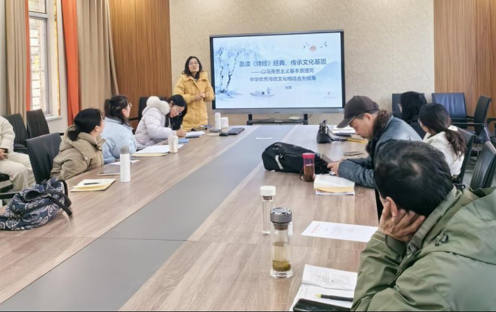 刘萍老师以《品读<诗经>经典 传承文化基因》为题,从“《诗经》概览”“思政价值”两个方面进行了阐述。课程研究室主任吴华彪认为,此次分享明亮、清晰、深刻,逻辑清晰,针对性强。将《诗经》的文化基因融入课堂教学,不仅有助于学生理解中华优秀传统文化的精神内核,更能在价值引导中增强文化自信,为推进课程思政提供了有益借鉴。