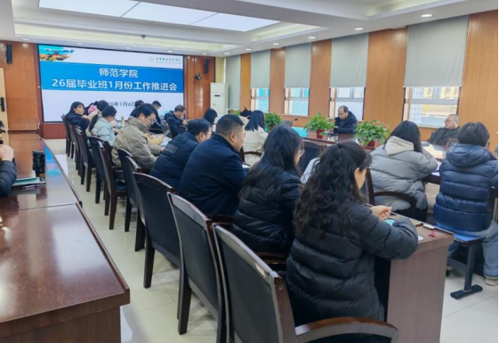 1月6日下午,师范学院在博爱楼四楼会议室召开2026届毕业班元月份工作专题会。师范学院副院长彭建设、吴卫明,就业办、教务科、学工科及全体毕业班班主任参加会议。本次会议旨在总结2025届毕业班工作经验,分析现状,明确任务,全力推进2026届毕业生工作。