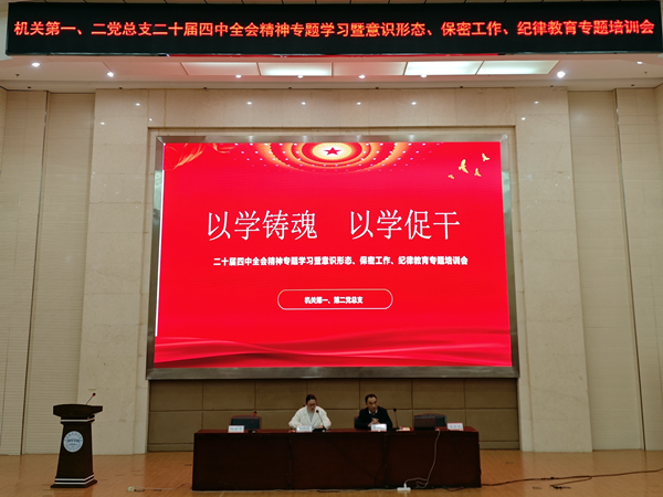 1月8日下午,机关第一、二党总支在图书馆二号学术报告厅召开党的二十届四中全会精神专题学习暨意识形态、保密工作、纪律教育专题培训会。机关处室全体人员参会。培训会由党委办公室主任毛成蕊主持。
