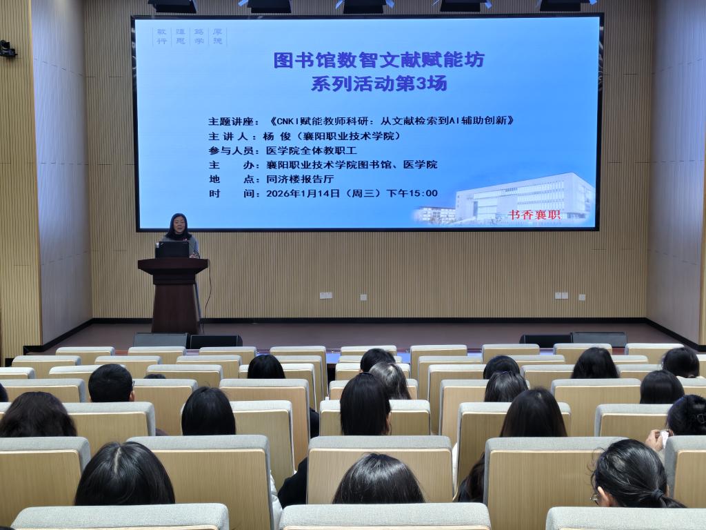 1月14日,图书馆与医学院在同济楼报告厅联合举办“CNKI赋能教师科研”专题培训。医学院全体教职工参与学习。培训聚焦数智化文献服务,助力教师科研提效。