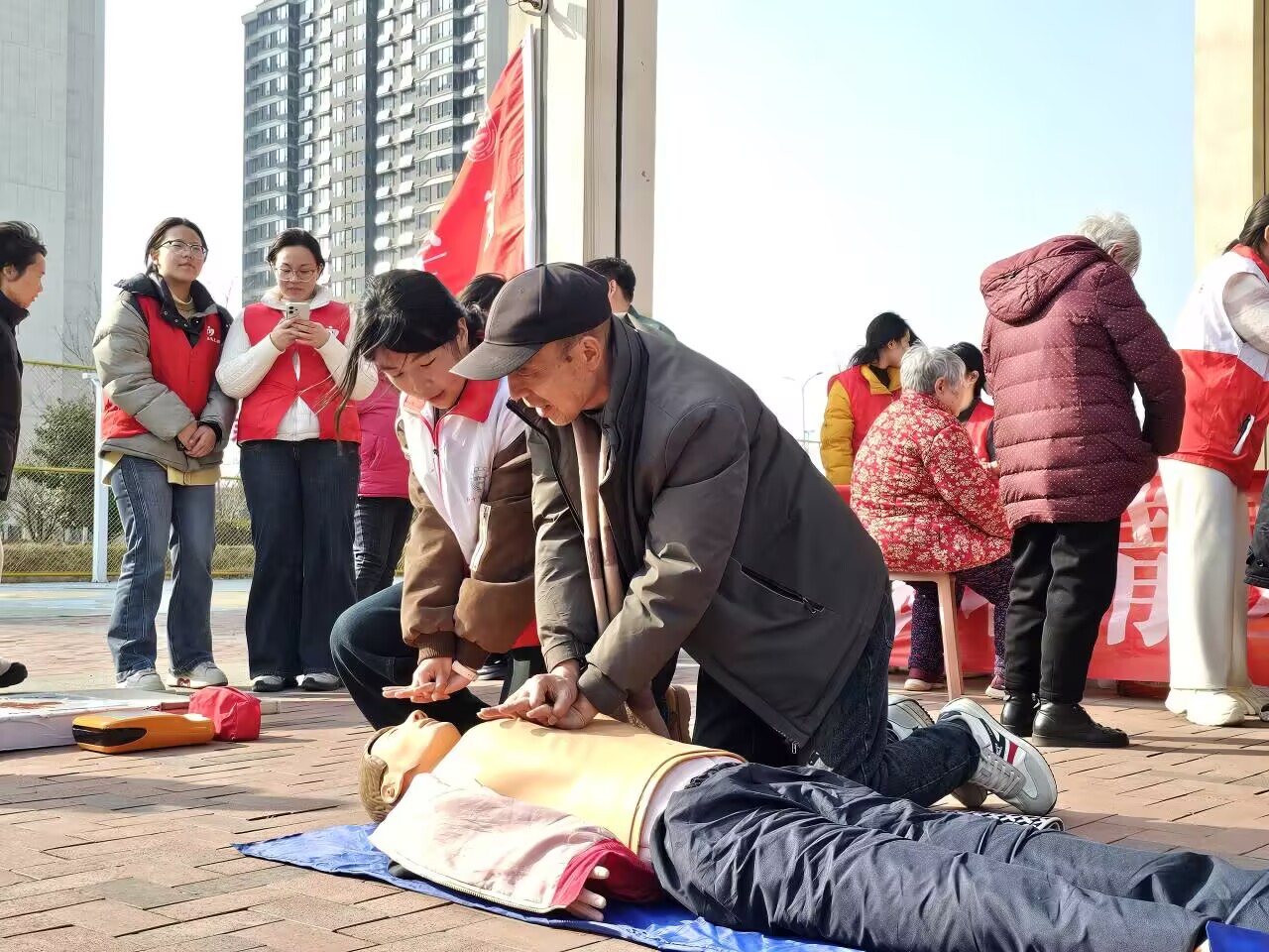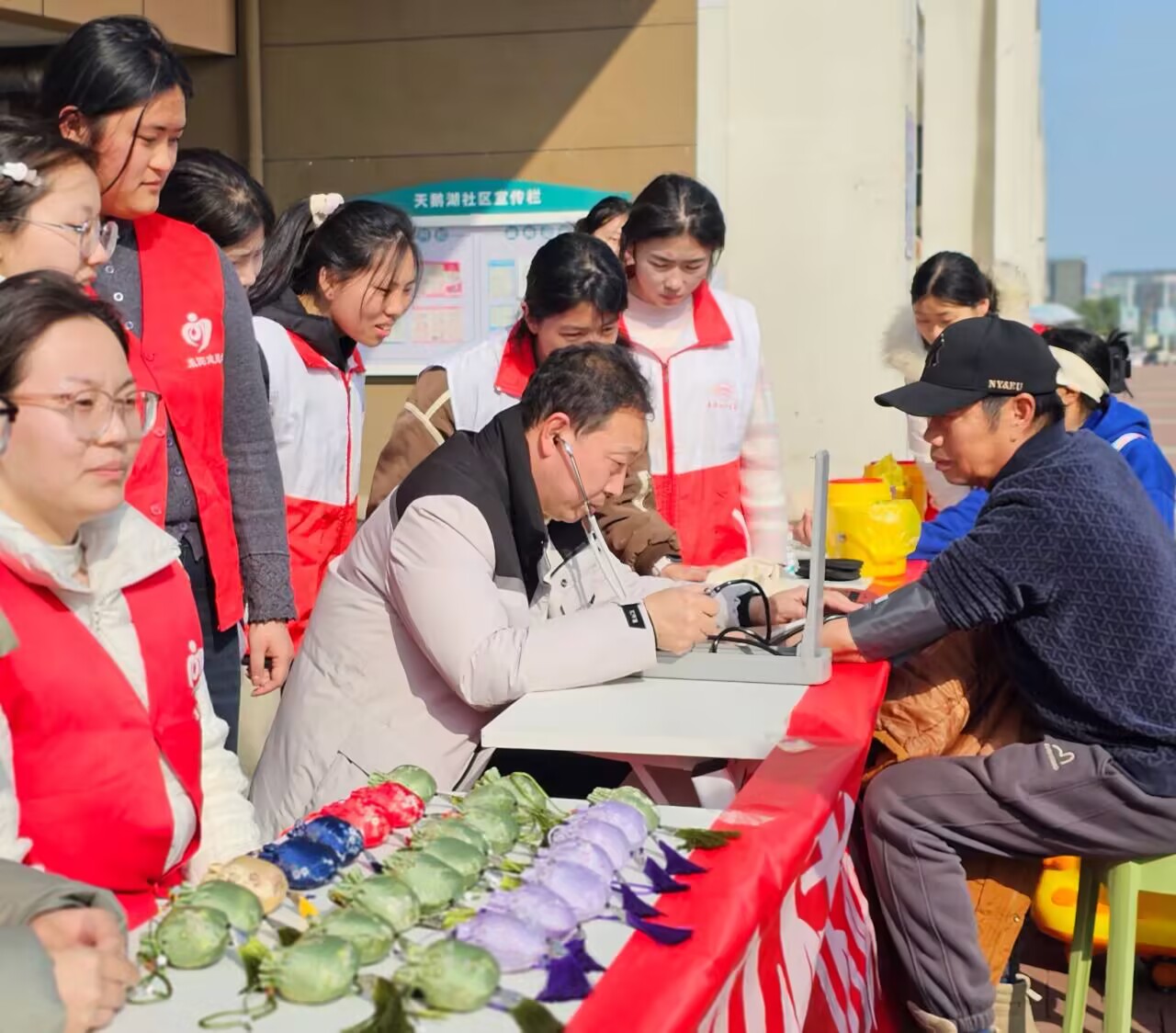 活动中,志愿者们分工协作,结合医学专业特色,现场分设中医养生体验、急救技能教学、基础健康义诊三大核心区域,一站式为居民提供健康服务。中医养生区里,志愿者手工制作驱蚊防感中药香囊赠予社区老人,现场冲泡金银花、菊花、薄荷等春季防流感代茶饮,同步讲解春季养生、流感防控等实用知识;校红十字会打造的“急救地摊”人气颇高。志愿者现场演示教学心肺复苏、止血包扎、骨折固定、海姆立克等急救技能,帮助居民掌握实用自救互救本领;义诊专区还为老人免费测量血压、血糖,问询身体状况,耐心解答各类健康疑问,把贴心健康服务送到居民身边。