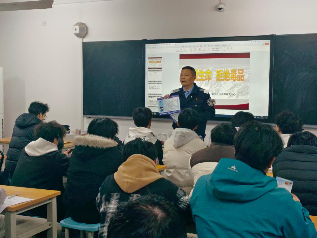 为深入推进青少年毒品预防教育工作,切实筑牢校园禁毒安全防线,3月17日下午,汽车工程学院(智能制造学院)联合隆中派出所、隆中社区戒毒康复中心,共同举办禁毒知识主题讲座。讲座邀请隆中派出所李警官担任主讲,学院副院长韩向东与2025级学生代表参加活动,禁毒社工全程参与协助。