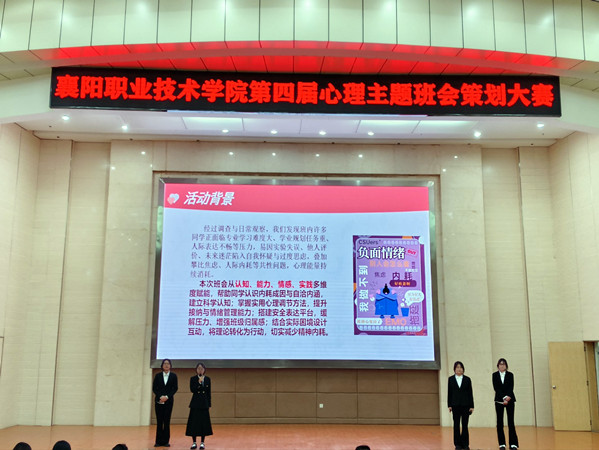 比赛现场,各参赛班级紧扣大学生成长中的真实心理需求,围绕自我关怀、情绪调节、人际关系、家庭影响等主题,轮番登台展示班会策划与实施成果。参赛的主题设计既接地气,又富有巧思,《爱你老己,明天见》以轻松自嘲的方式探讨延迟满足与自我善待;《拒绝内耗,做一个快乐淡人》将网络热词转化为积极心理学的实践指南;《宿舍关系通关指南》用游戏化思维拆解寝室相处的难题;《以动养身,以悦养心》强调身心互促的健康理念;《同甘共苦并肩前行》传递朋辈支持的温暖力量;《原生家庭的解码与重生》则鼓励同学们正视成长背景,勇敢与过去和解。各班级通过策划思路讲解、班会实况视频、互动片段再现以及复盘反思等环节,将心理育人的温度与深度生动呈现。
