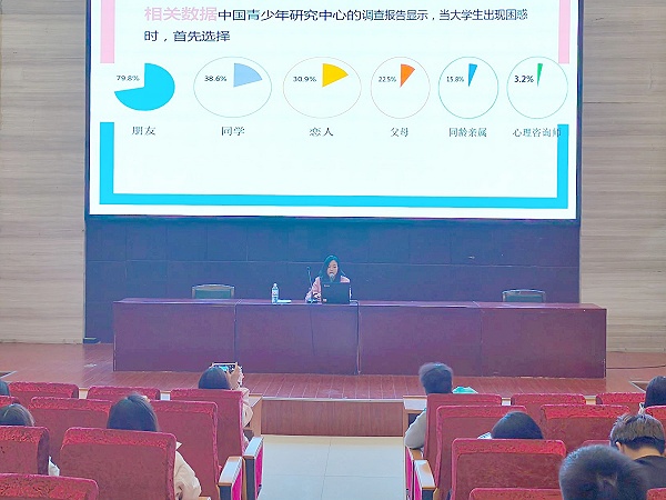 4月10日下午4时,由大学生心理健康教育中心主办的第六期心理委员专题培训在两校区同步开展。隆中路校区培训在图书馆一号报告厅举行,高铁南路校区培训在嘉禾楼205教室举行,分别由杜慧楠老师、温迎老师担任主讲。本次培训以《朋辈沟通技巧》为主题,两校区心理委员共同参训。