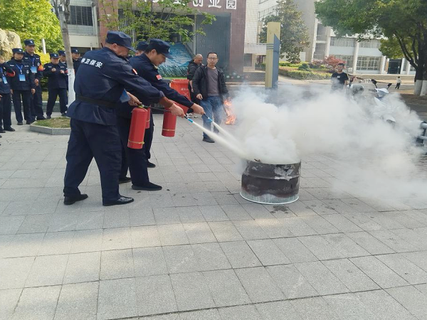 实操环节,现场摆放了干粉灭火器等消防器材,点燃了初期火灾火盆。在保卫处工作人员的现场指导下,安保队员分组进行实操演练,逐一上手操作灭火器。从检查压力表、提起灭火器、拔掉保险销,到握住喷管对准火焰根部、按压压把喷射,每一个动作都严格按照规范流程执行,工作人员全程巡视,对操作不规范的队员及时纠正,耐心讲解动作细节,确保每位队员都能熟练掌握操作技巧。队员们态度认真、反应迅速,配合默契,顺利完成了初期火灾扑救实操任务。