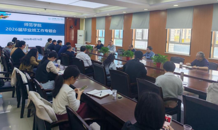 4月16日下午,师范学院在博爱楼四楼会议室召开2026届毕业班4月份工作专题会。师范学院党总支书记韩景,副院长彭建设、吴卫明,就业办、教务科、学工科、产学研全体工作人员及全体毕业班班主任参加会议。