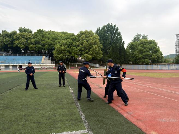 为进一步强化校园安全防线,提升安保队员反恐防暴应急处置能力,有效防范化解校园各类安全风险,保障广大师生生命财产安全和校园稳定,4月27日下午,保卫处分别在隆中路校区、高铁南路校区组织全体安保队员开展反恐防暴演练。隆中派出所、东津派出所警官到场指导。