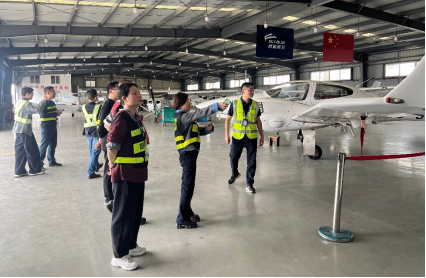 抵达蔚蓝航校机场后,在航校工作人员的陪同下,周秀丽等实地参观了航校停机场及各类型小型飞机,近距离察看了飞行训练机型,详细了解了飞行驾驶的培训流程、航空器日常维护及机场运行管理体系。