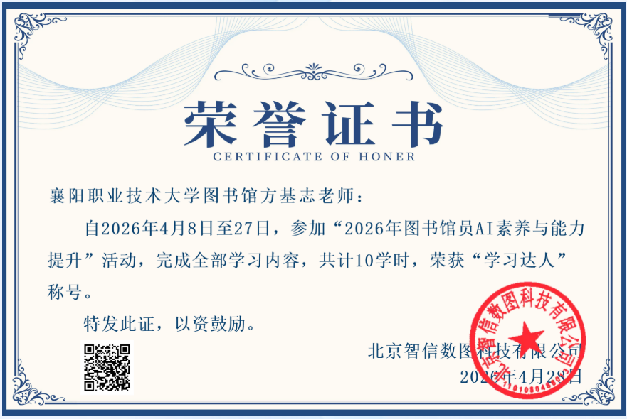 近日,由北京智信数图科技有限公司联合全国十余家省级高校图工委共同主办的“2026年高校图书馆员AI素养与能力提升”活动圆满落幕。图书馆表现突出,14位老师成功入选“学习达人”,充分彰显了图书馆团队过硬的AI素养与专业能力。
