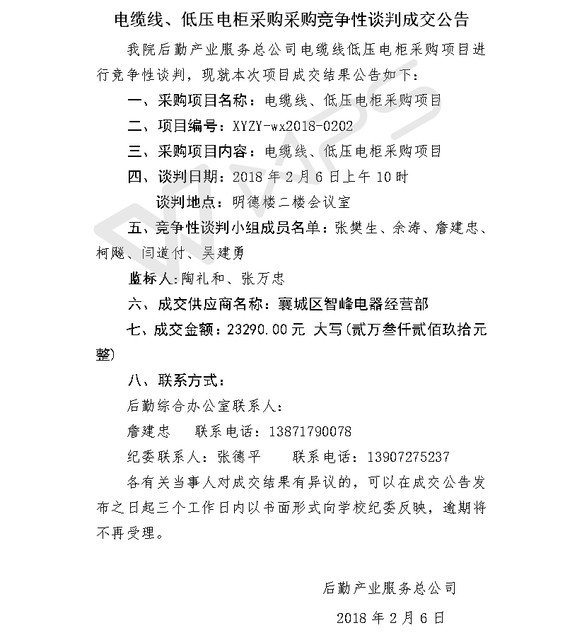 电缆线、低压电柜采购采购竞争性谈判成交公告