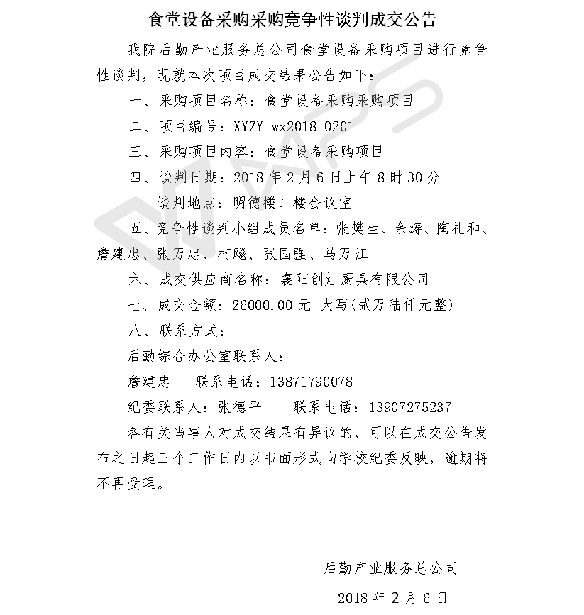 食堂设备采购采购竞争性谈判成交公告