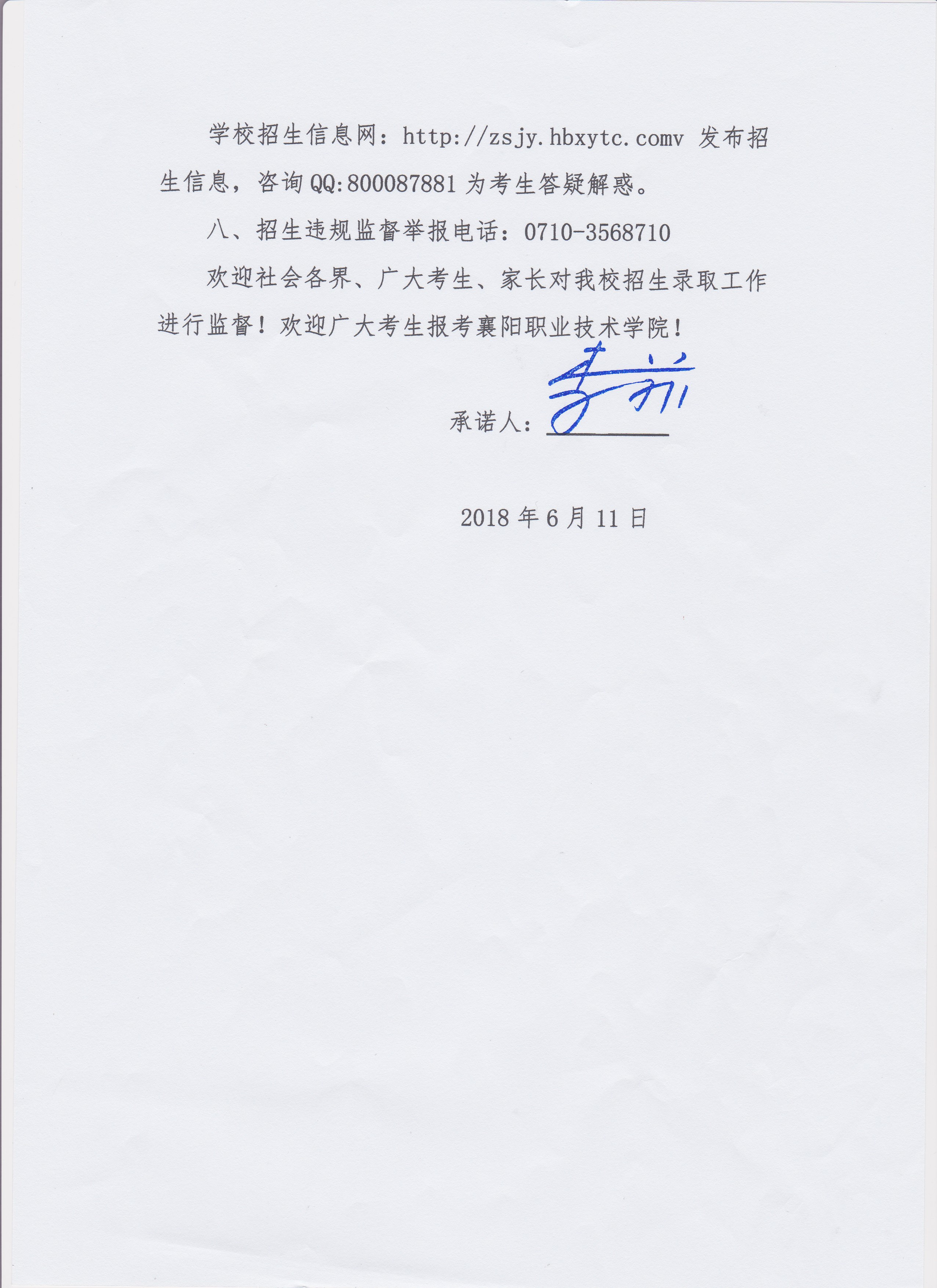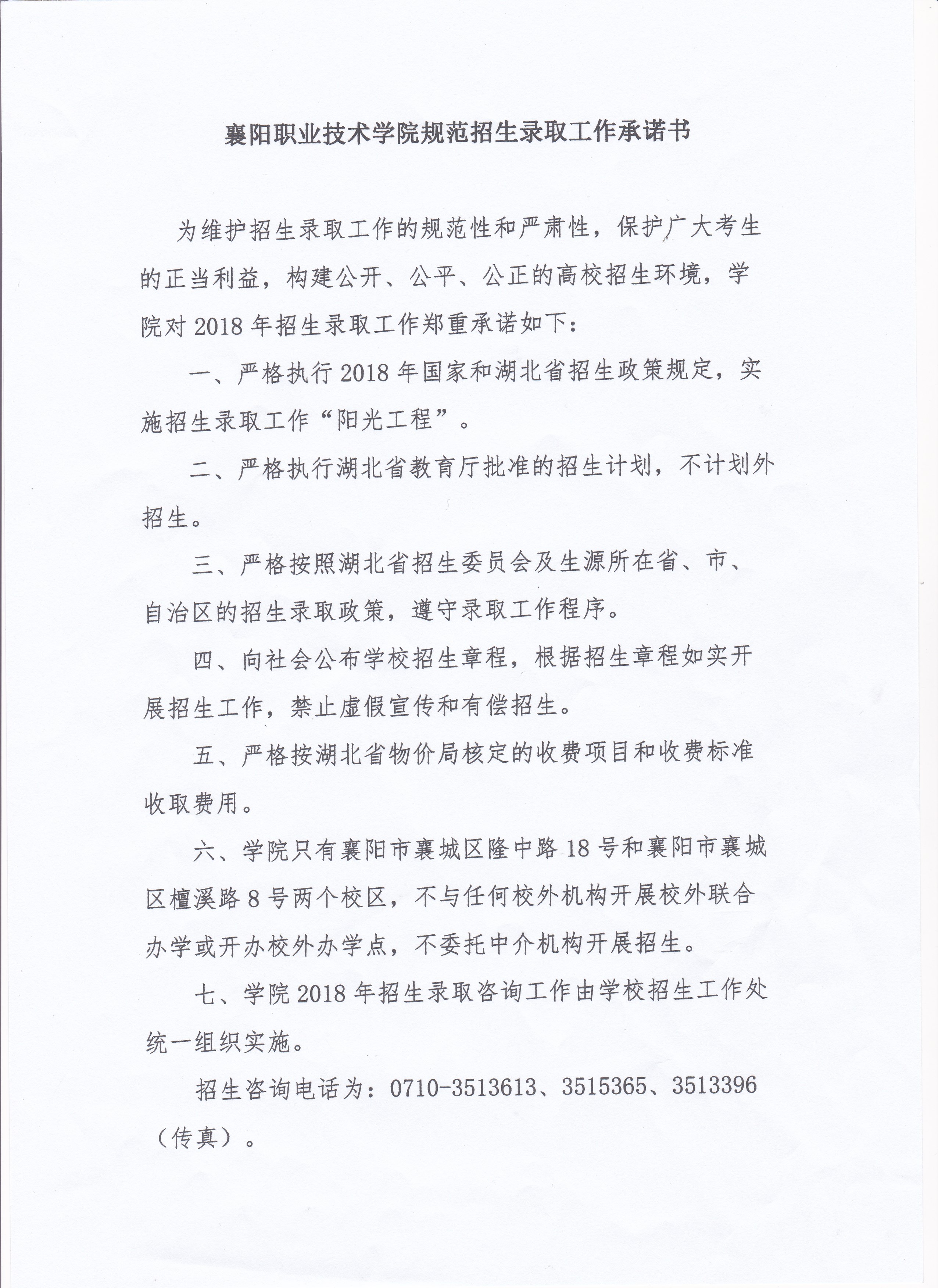 襄阳职业技术学院规范招生录取工作承诺书