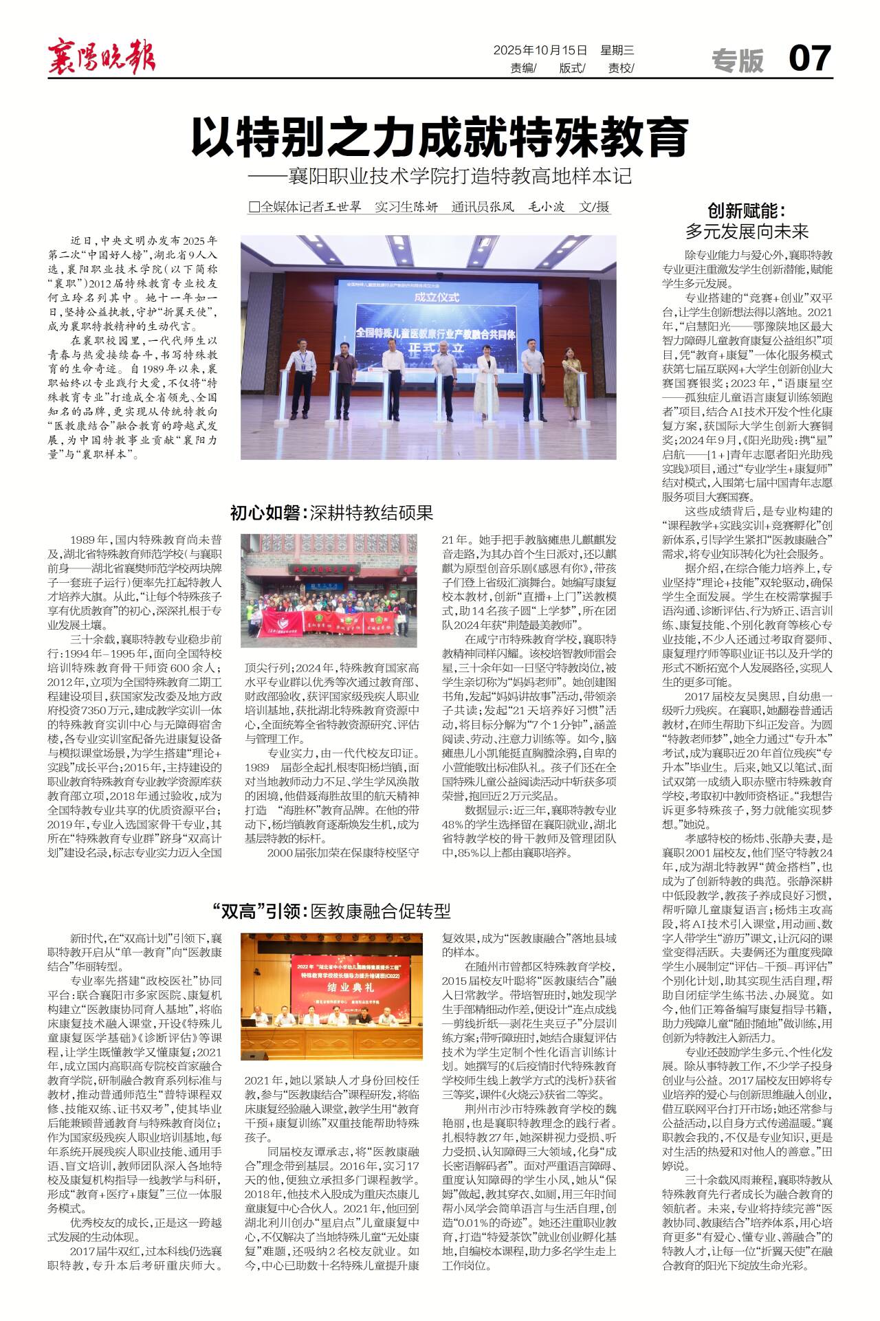 三十余载风雨兼程,襄职特教从特殊教育的先行者,成长为融合教育的领航者。未来,专业将持续完善“医教协同、教康结合”的培养体系,着力培育更多“有爱心、懂专业、善融合”的特教人才。