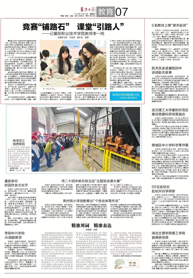 襄阳职业技术学院师范学院青年教师李一鸣,入职仅两年,便在教学、竞赛、科研、社会服务领域交出亮眼答卷:指导学生获2025年世界职业院校技能大赛金奖,所带班级获评2024年度“优秀班级”,参与申报立项2025年各族青少年交流计划等省级试点项目,还承担省级、市级社会培训10余次,服务超1500人次。