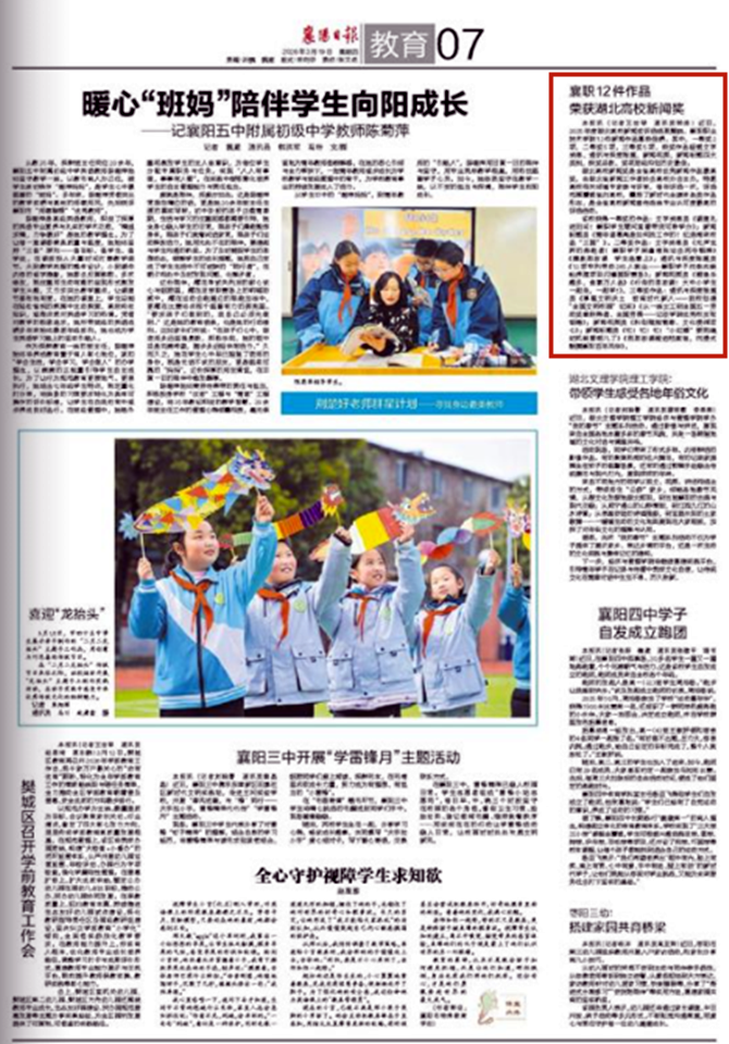 本报讯(记者王世翠 通讯员钟炜)近日,2025年度湖北高校新闻奖评选结果揭晓。襄阳职业技术学院12件新闻作品喜获佳绩。其中,一等奖2项,二等奖5项,三等奖5项,获奖作品涵盖文字消息、通讯与深度报道、新闻视频、新闻标题四大类别,获奖总数、奖项层级均创历史最佳。
