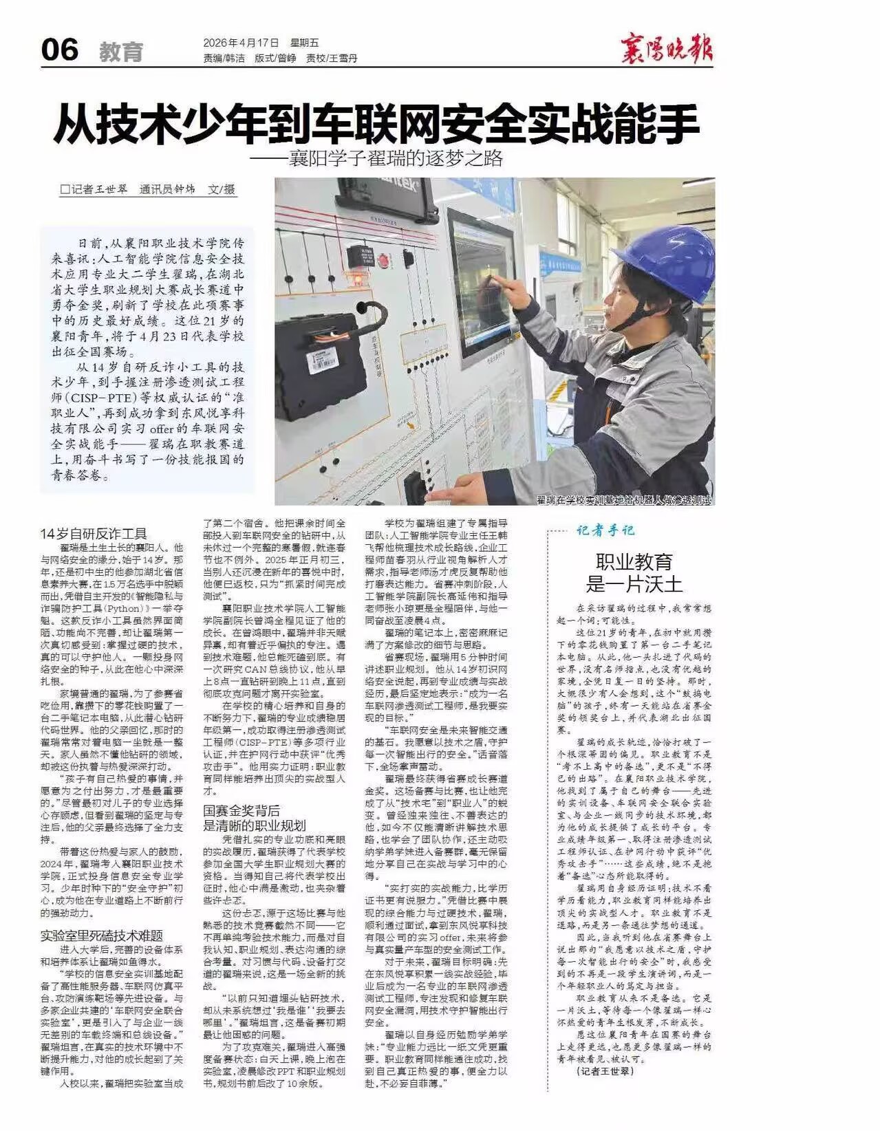 从14岁自研反诈小工具的技术少年,到手握注册渗透测试工程师(CISP-PTE)等权威认证的“准职业人”,再到成功拿到东风悦享科技有限公司实习offer的车联网安全实战能手——翟瑞在职教赛道上,用奋斗书写了一份技能报国的青春答卷。