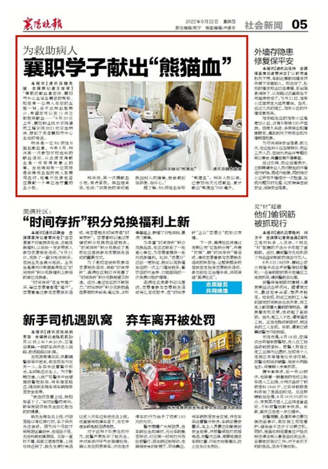本报讯【通讯员魏先骏 全媒体记者王世翠】“尊敬的献血者您好,襄阳市中心血站急需您的帮助,现在有一位病人与您的血型一样,由于此种血型稀少,希望您可以在11点之前赶来献血……”9月20日上午,襄阳职业技术学院建筑工程学院2021级学生明洪,接到了来自襄阳市中心血站的电话。