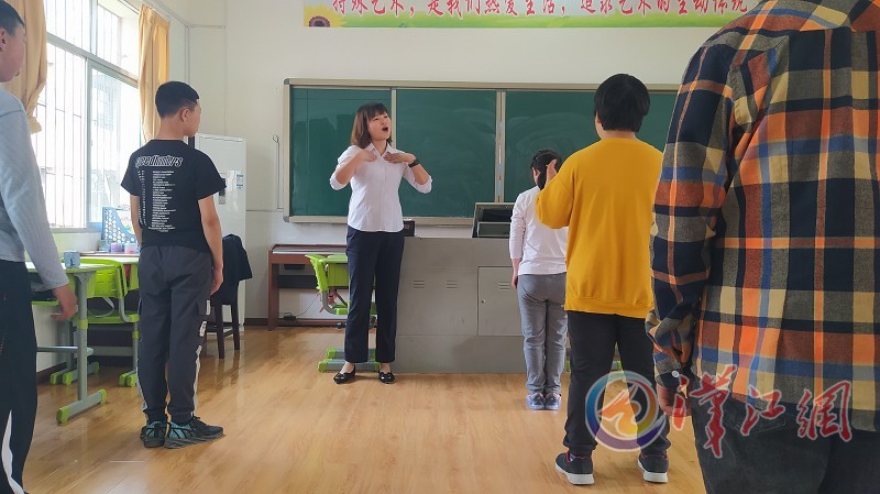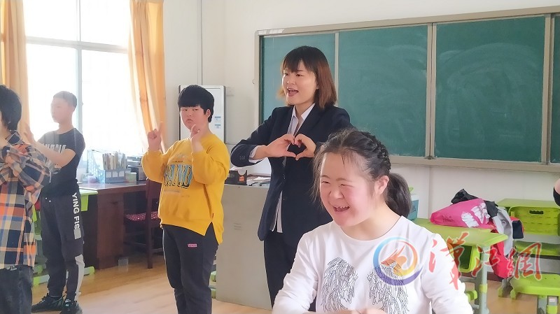 5月11日上午11时许,在保康县特殊教育学校“培智四年级”的教室,随着《听我说谢谢你》的音乐响起,学生们跟随一位身穿黑色职业装的年轻女教师跳起律动操。只见女教师面带微笑、动作轻盈,不时纠正少数学生的不规范动作。