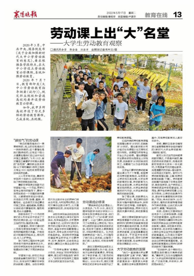 “在实践中,各个高校可以根据自身的情况开展劳动教育。”襄职学工处处长但耀卿表示:“大学生的劳动教育应该连续、广泛地开展,并将学分、学时落实到位。”